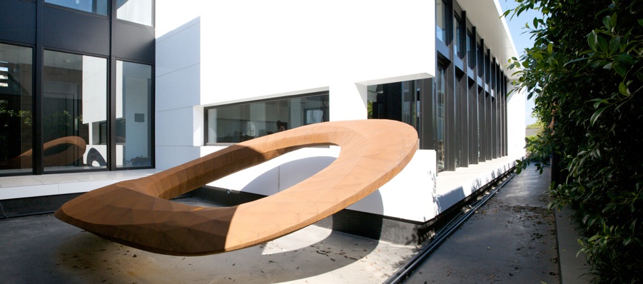 ‘Torus’ symbolises the dynamic and strongly connected nature of their family life. The rounded form offers a foil to the minimalist modern architecture and its concealed pedestal and boldly cantilevered mass give a sense of movement and dynamism to the space.